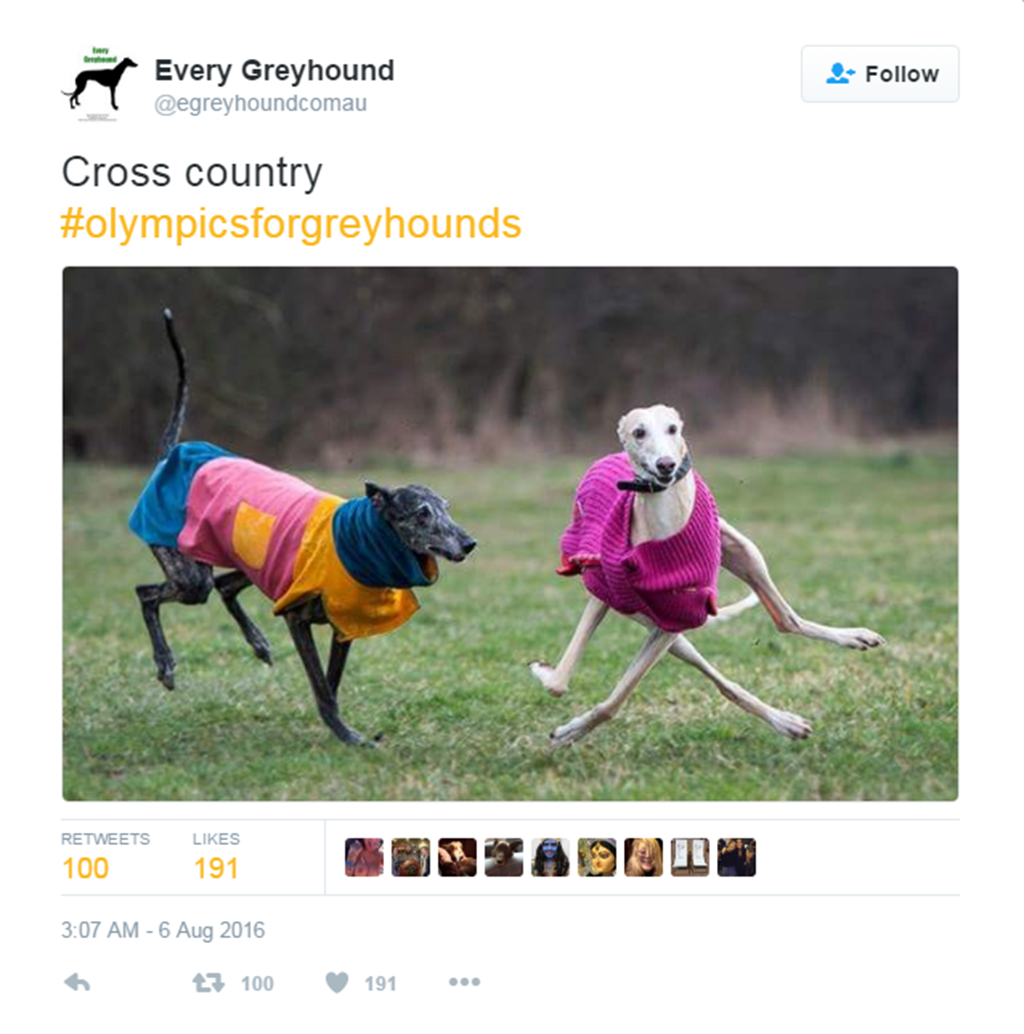 „Organizacija Every Greyhound nikada ne bi uspela u svojim namerama bez društvenih mreža“, ističe direktorka Angela Rasel. Pokretanjem Twitter naloga 2012. godine uspeli su da promovišu svoju organizaciju kao prihvatilište za ljubimce i predstave pse koji su spremni da budu udomljeni.
